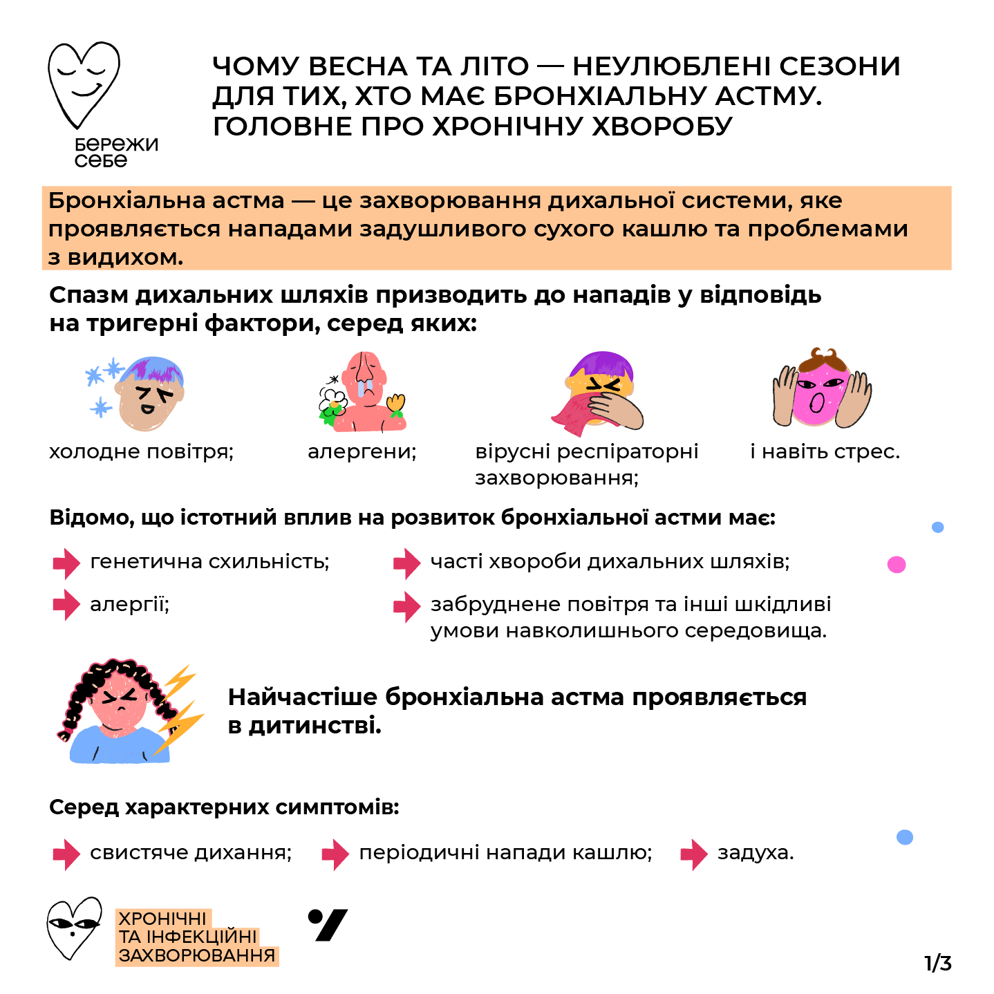 – несприятливі погодні умови (холодне повітря), сильне емоційне (страх або гнів) та фізичне навантаження можуть викликати посилення симптомів або розвиток ускладнень астми.