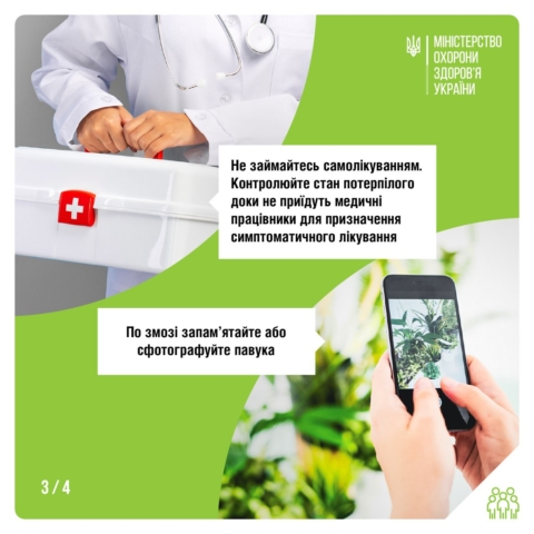 В разі укусу важливо звернутися до найближчого медзакладу: лікар огляне місце укусу та надасть рекомендації щодо подальшого нагляду чи лікування, враховуючи стан здоров’я постраждалого. У випадку алергічної реакції на укус та погіршення самопочуття пацієнта можуть направити на лікування до стаціонару для подальшого симптоматичного лікування.