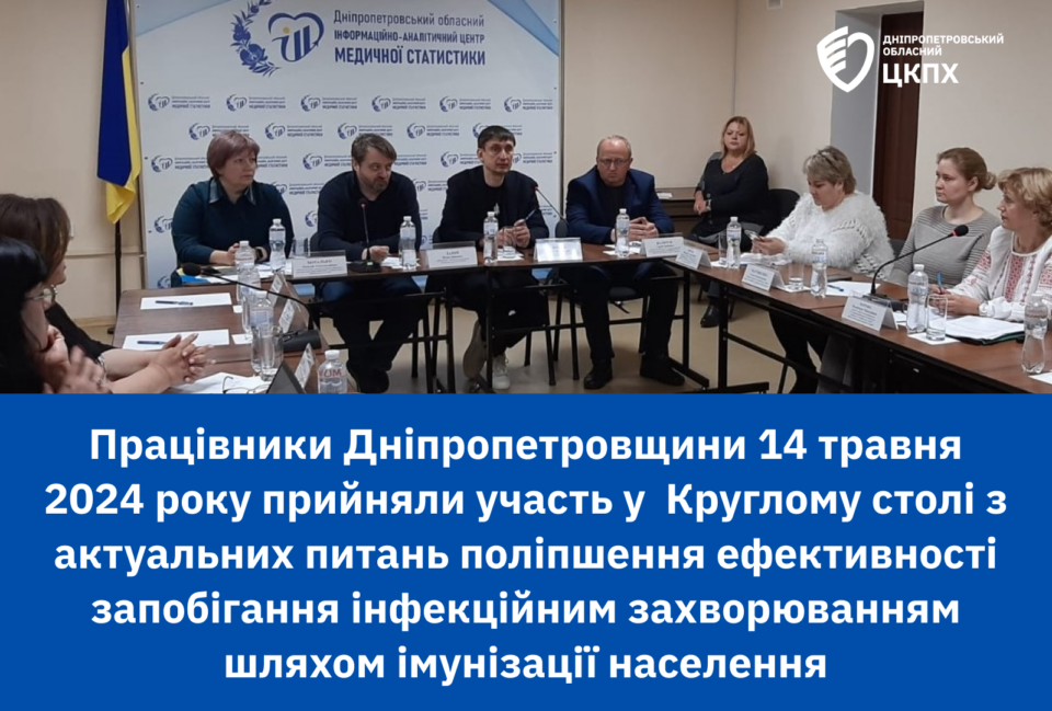 За підтримки Міністерства охорони здоров’я України у співпраці зі Світовим банком проєкту «Екстрене реагування на COVID-19 та вакцинація в Україні» медичні працівники Дніпропетровщини 14 травня 2024 року мали змогу прийняти участь у Круглому столі з актуальних питань поліпшення ефективності запобігання інфекційним захворюванням шляхом імунізації населення.