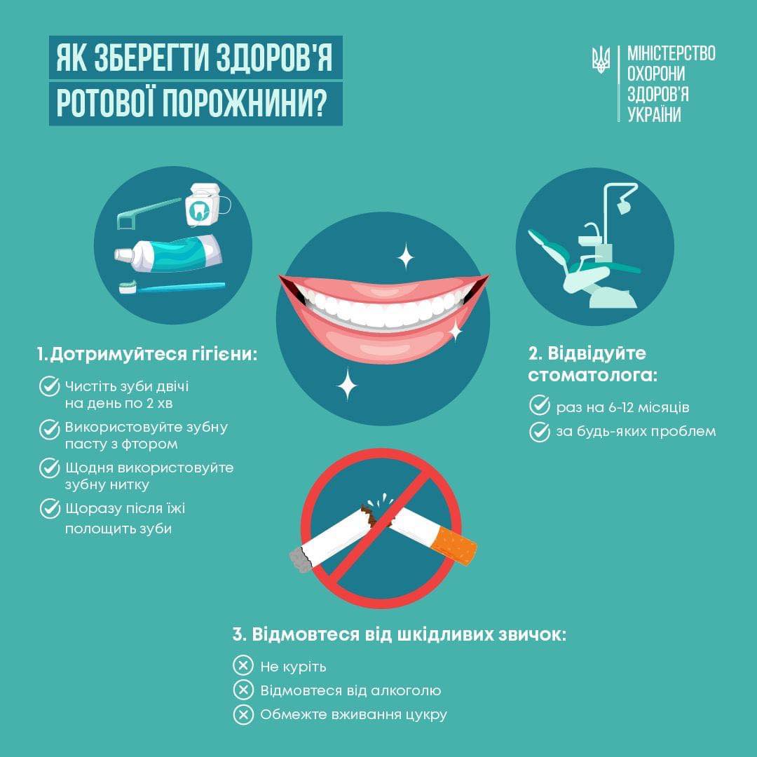 – Чистіть зуби зубною пастою з фтором упродовж двох хвилин два рази на день. Якщо не маєте змоги почистити зуби — полощіть рот рідиною із фтором або жуйте гумку без цукру після їжі й перекусів.