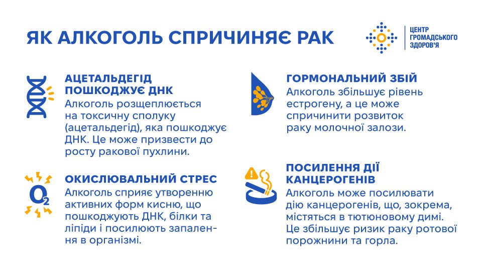 1. Алкоголь розщеплюється до ацетальдегіду — токсичної сполуки, яка зв’язується з ДНК і пошкоджує її. Це може призвести до неконтрольованого росту клітин і формування ракової пухлини.