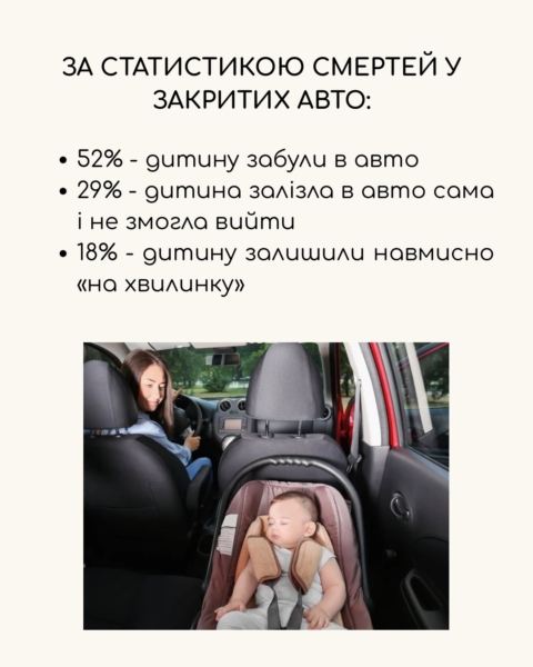 Статистика смертей дітей у авто за понад 20 років у США показала, що у 53% випадків смертей від теплового удару дитину у салоні забував дорослий.