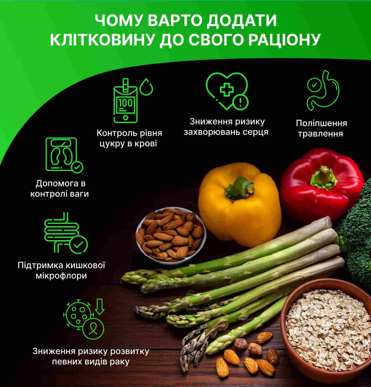 ⠀ Нерозчинна клітковина –прискорює проходження їжі по шлунково-кишковому тракту, вбирає у себе рідину та абсорбує токсичні речовини, що утворюються в процесі травлення. Вживання саме нерозчинної клітковини сприяє очищенню організму та перешкоджають розвитку закрепу.