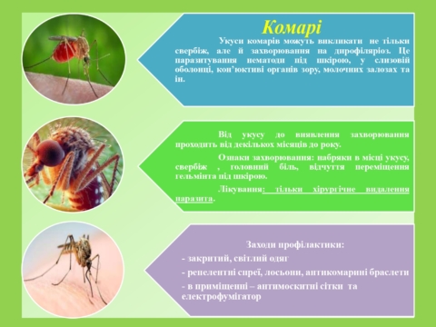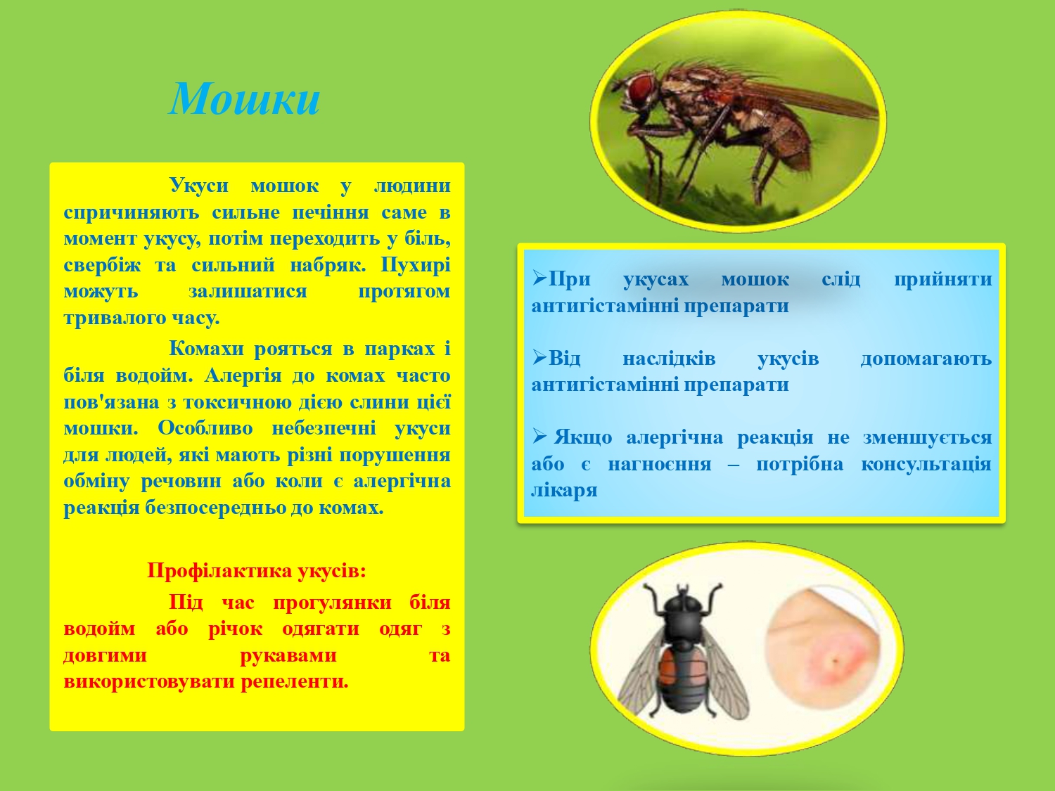• Комарі — викликають свербіж, алергію, а іноді переносять небезпечні інфекції.