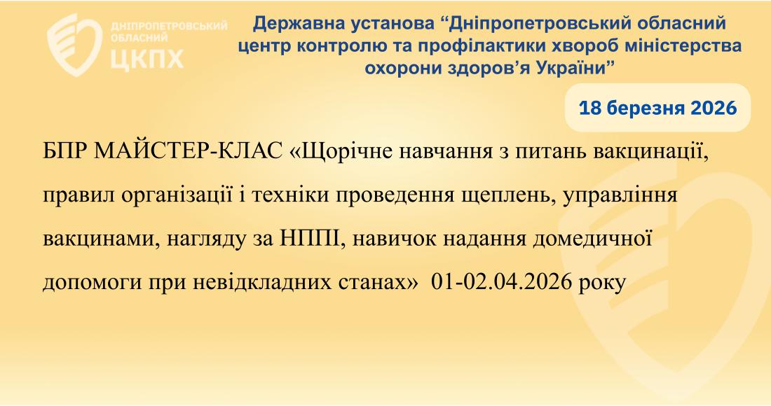 01-02 квітня 2026 року з 10:00 до 14:20 відбудеться захід безперервного професійного розвитку (БПР) в дистанційному режимі у реальному часі на тему: «Щорічне навчання з питань вакцинації, правил організації і техніки проведення щеплень, управління вакцинами, нагляду за НППІ, навичок надання домедичної допомоги при невідкладних станах»