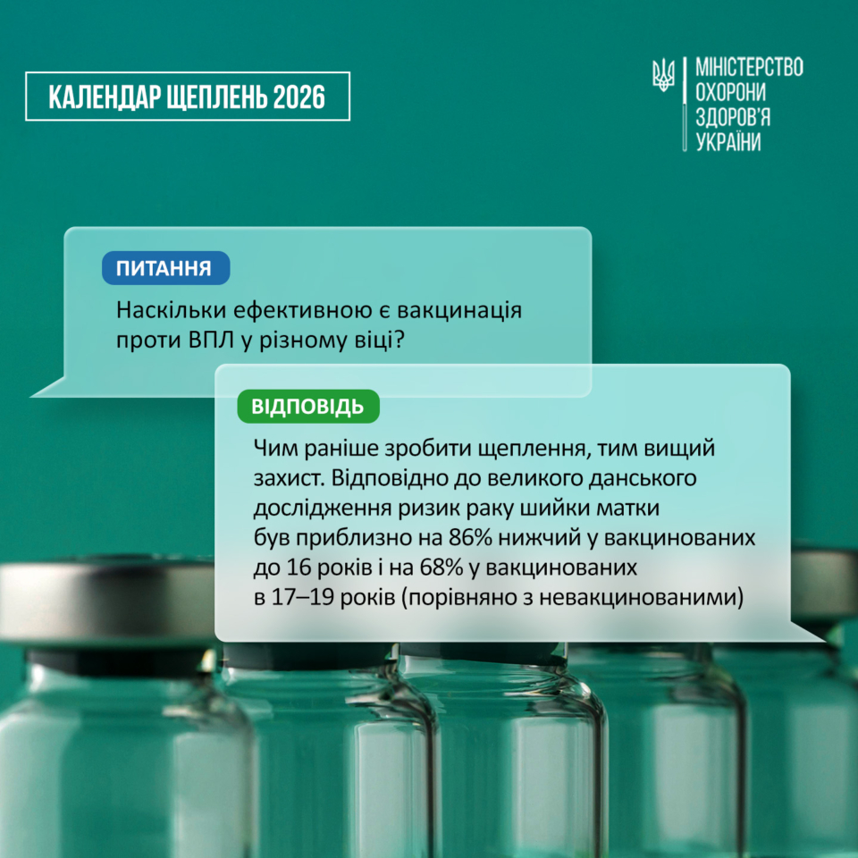 💬 Вакцинація є найдієвішим способом захисту від ВПЛ. У вакцинованих дівчат ризик раку шийки матки знижується на ~86 %, якщо вакцинацію проведено до 16 років, і на ~68 %, якщо вакцинацію зроблено у віці 17–19 років. https://shorturl.at/JLHdI