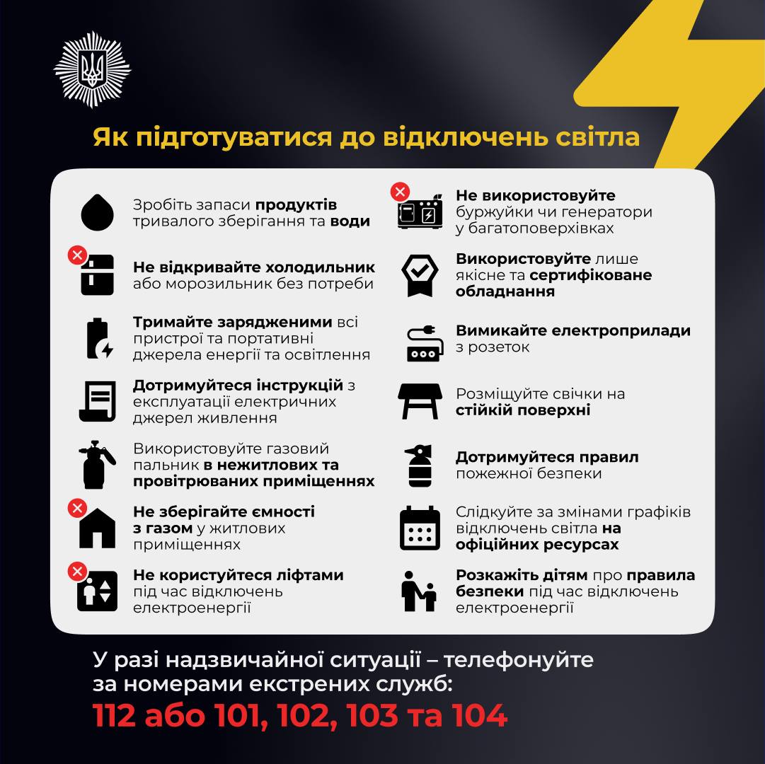 У разі надзвичайних ситуацій — звертайтеся за номерами екстрених служб: 101, 102, 103 та 104. Бережіть себе та дотримуйтесь базових правил під час відключення електроенергії!
