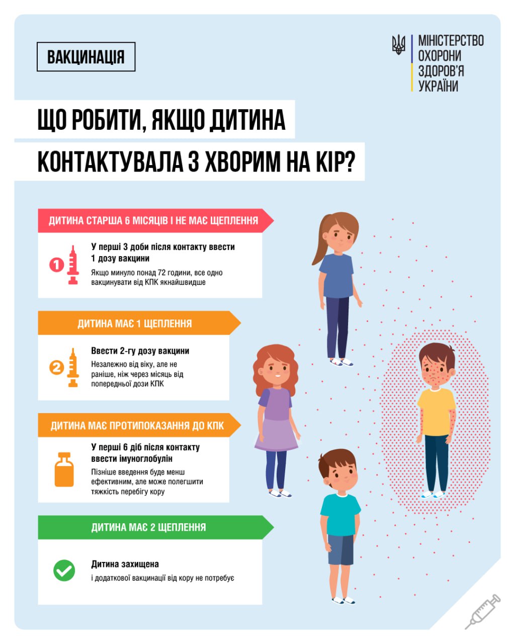 – Якщо дитина віком від 6 місяців до 12 місяців контактувала з хворим на кір, їй необхідно якнайшвидше – бажано протягом 72 годин – ввести одну дозу вакцини КПК.