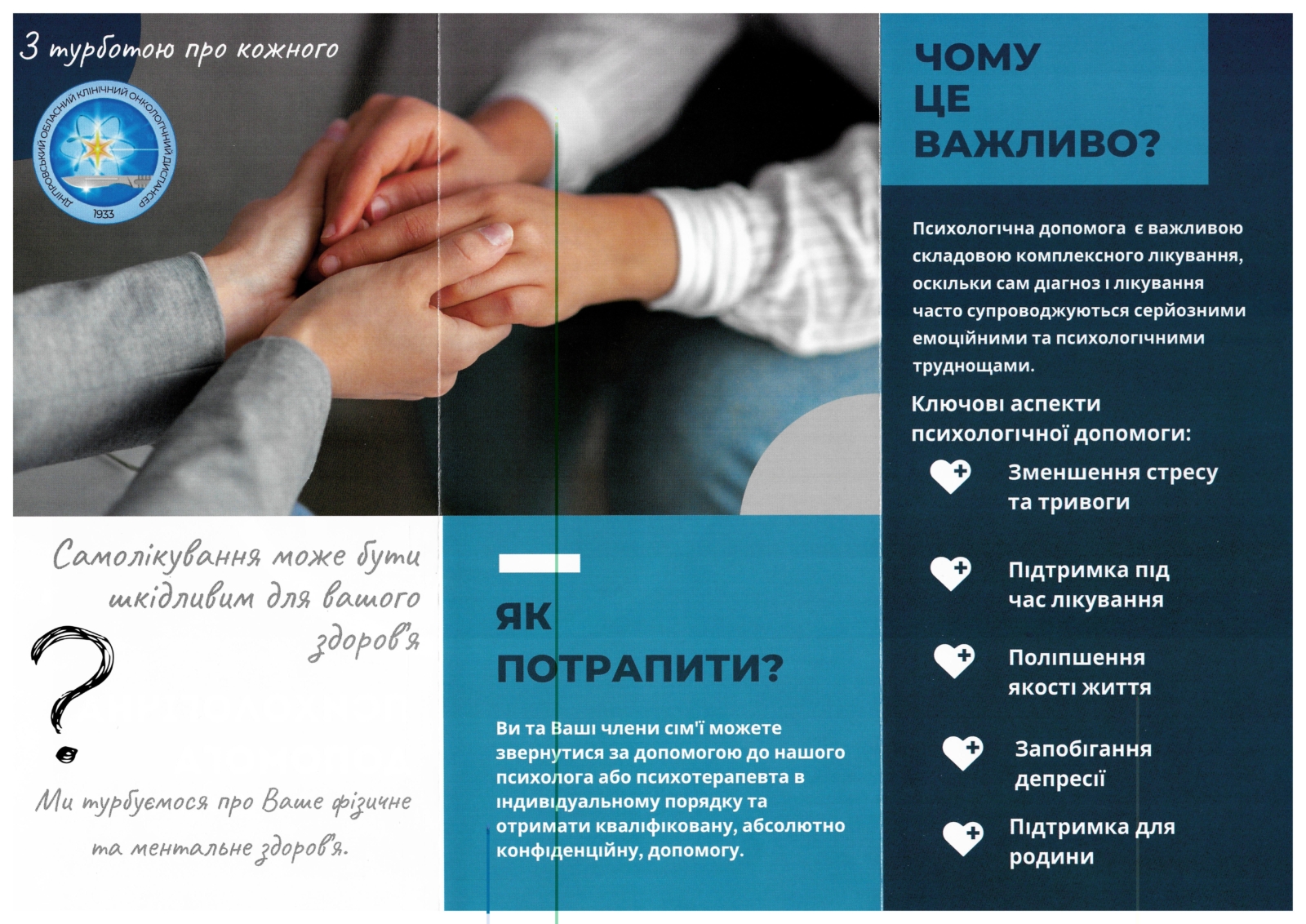 При зустрічі керівників було обговорено питання надання пацієнтам психологічної допомоги, якої так потребує категорія онкологічних хворих. З’ясувалось, що дане питання в діспансері вирішено. Зацікавлені можуть звернутися за допомогою за посиланням, розташованим на фото в публікації!