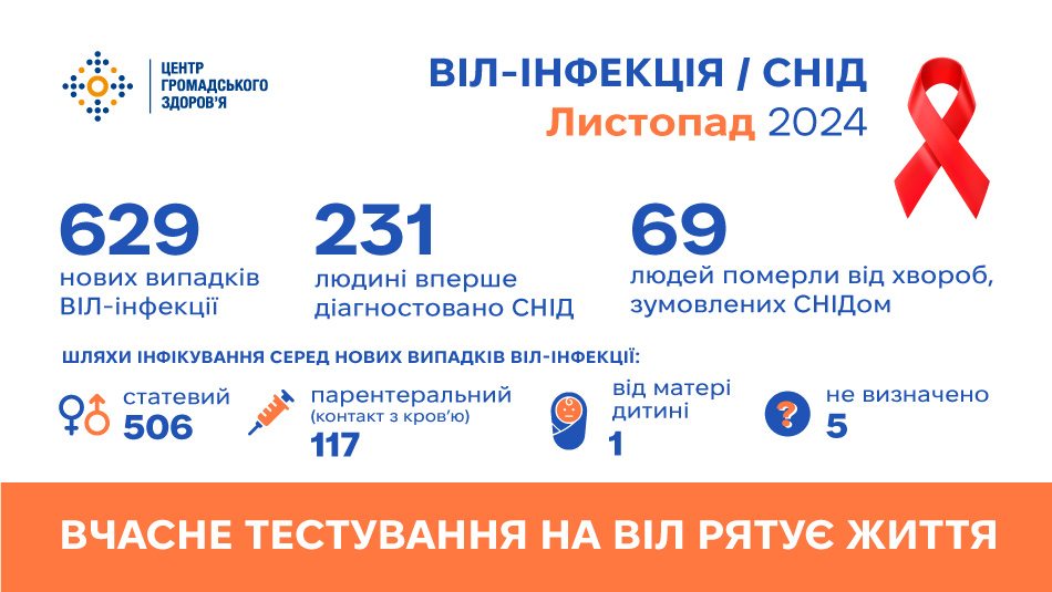 13 грудня 2024У листопаді 2024 року в Україні офіційно зареєстровано 629 нових випадків ВІЛ-інфекції, у 231 пацієнта вперше діагностовано СНІД, 69 людей померли від хвороб, зумовлених СНІДом.