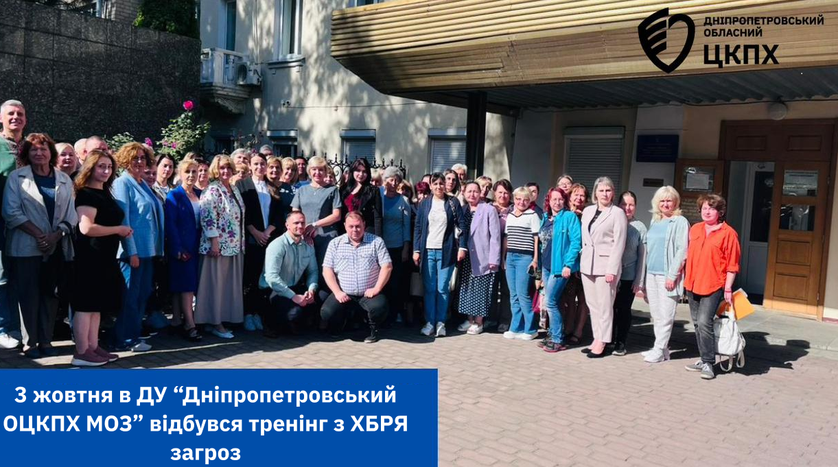 За ініціативи Головного державного санітарного лікаря Дніпропетровської області, генерального директора ДУ «Дніпропетровський ОЦКПХ МОЗ» Сергія ВАЛЬЧУКА 03 жовтня 2024 року проведений тренінг «Посилення спроможності реагування на ХБРЯ (хімічні, біологічні, радіаційні/ядерні) загрози». Тренінг організовано на основі інформації, наданої іноземними партнерами, відповідно до заходу який відбувся в місті Кракові з 2 по 8 вересня.