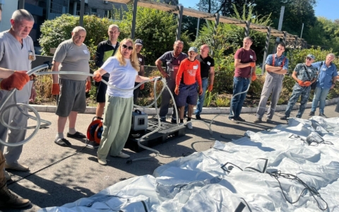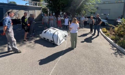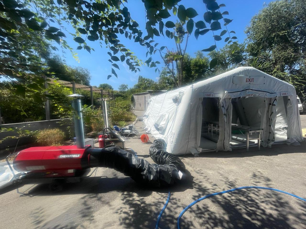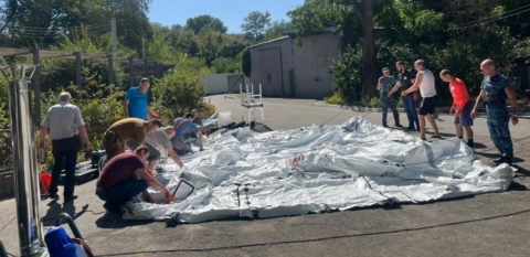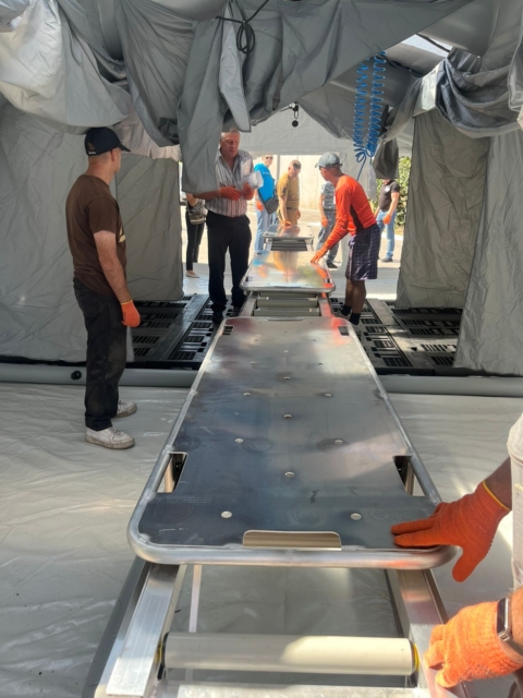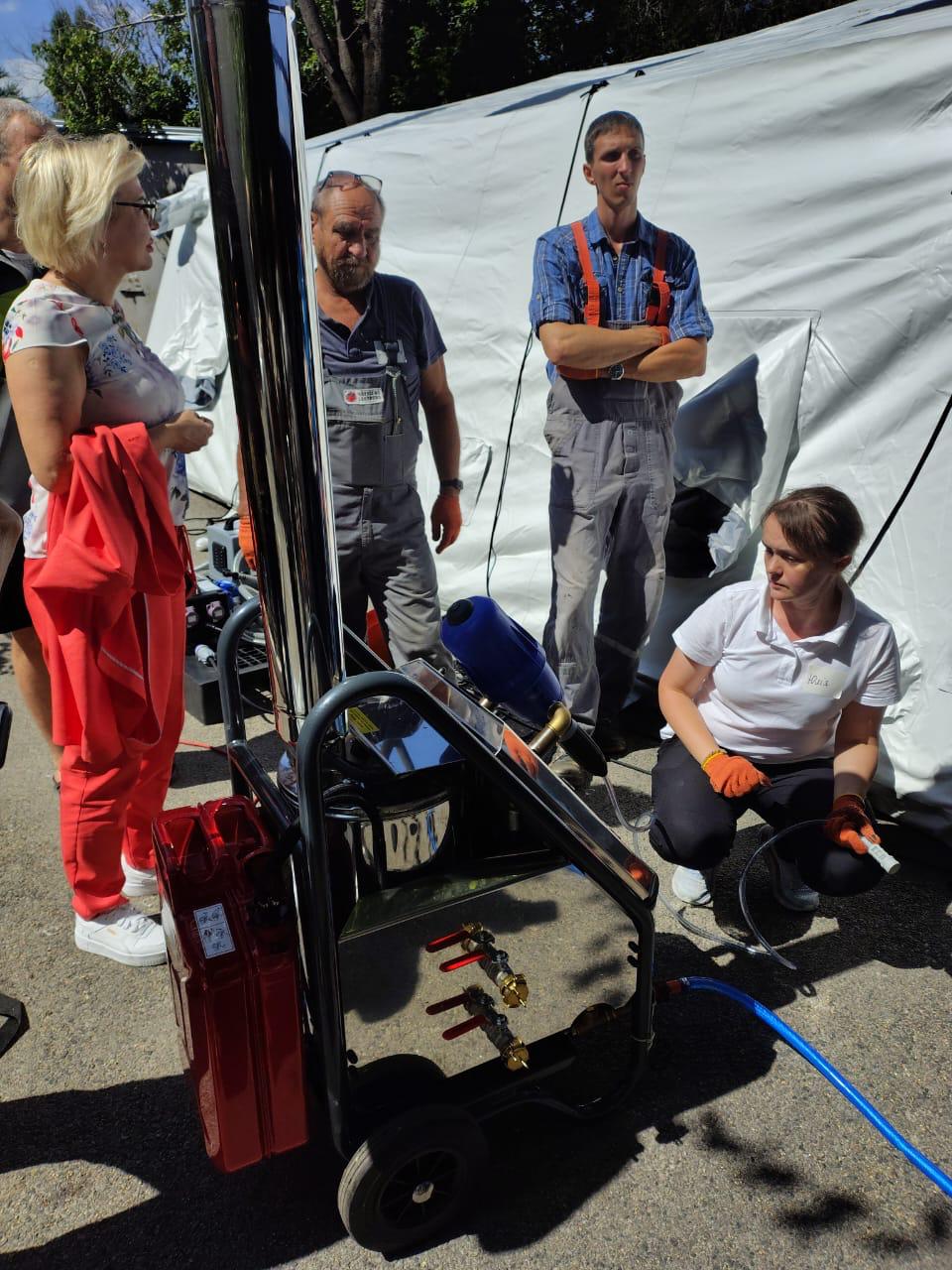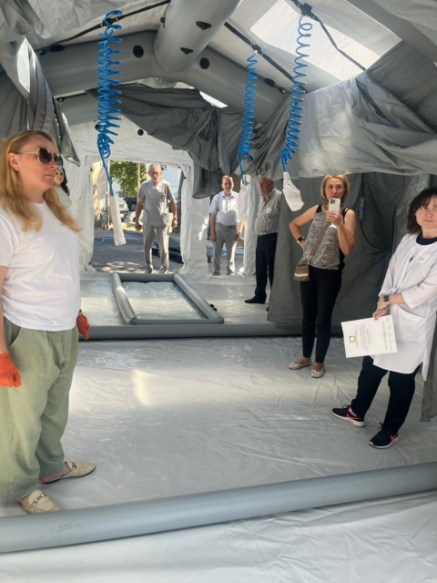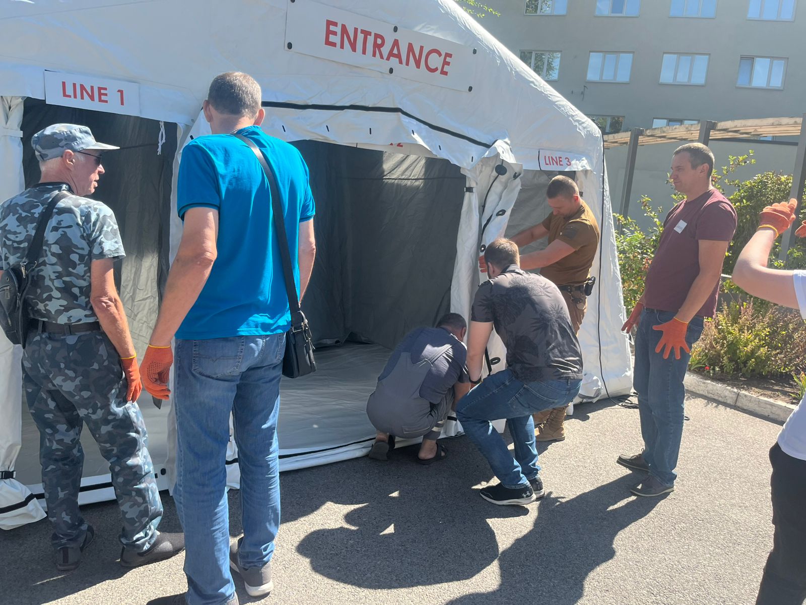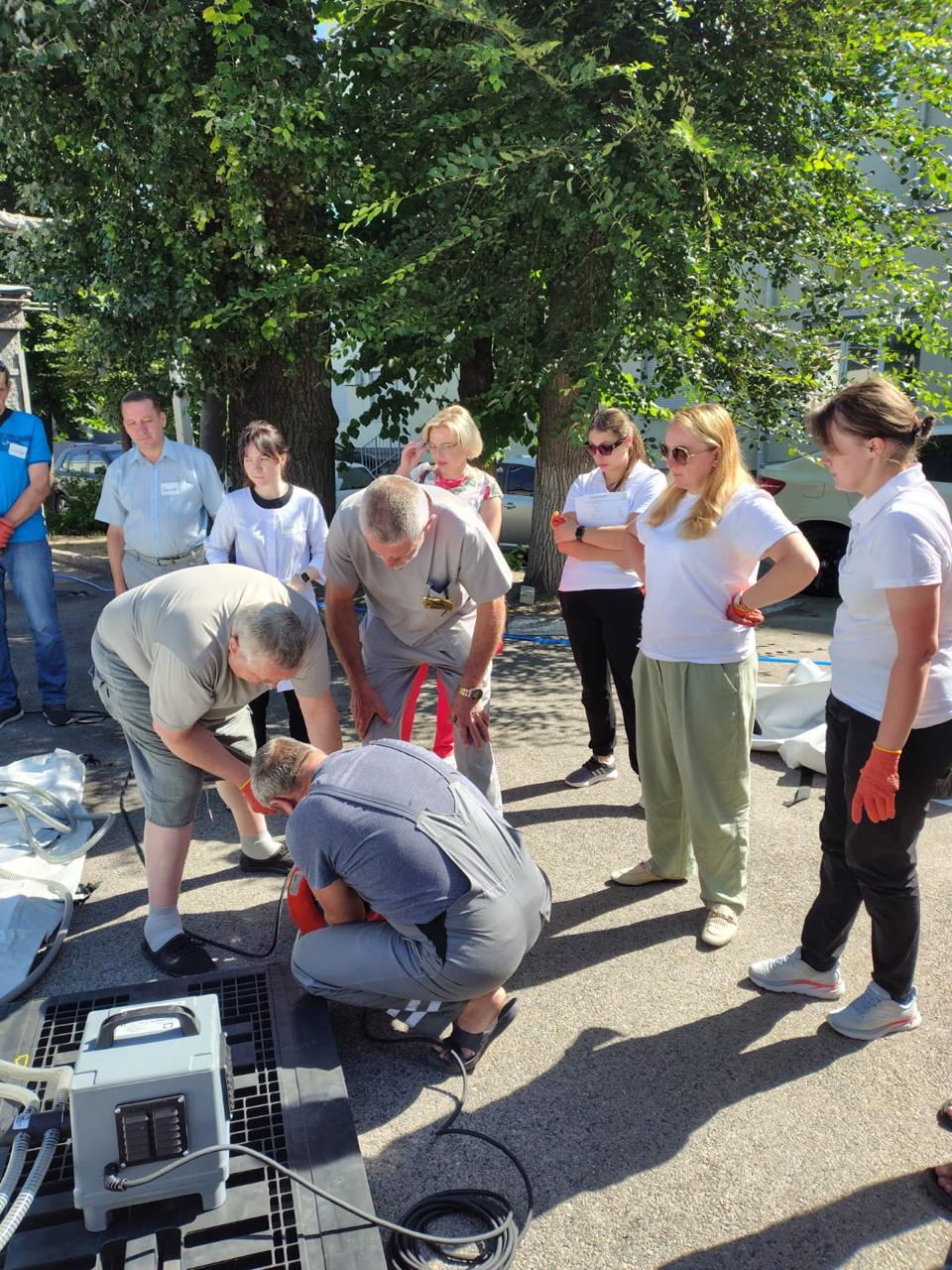 Під час симуляційних вправ було проведено огляд комплектації намету та принципів роботи, відпрацьовано навички розгортання та згортання намету з акцентом на командну роботу та вибір правильного місця розташування з урахуванням можливих потоків постраждалих, а також обговорено технічні аспекти інсталяції та експлуатації деконтамінаційного намету.