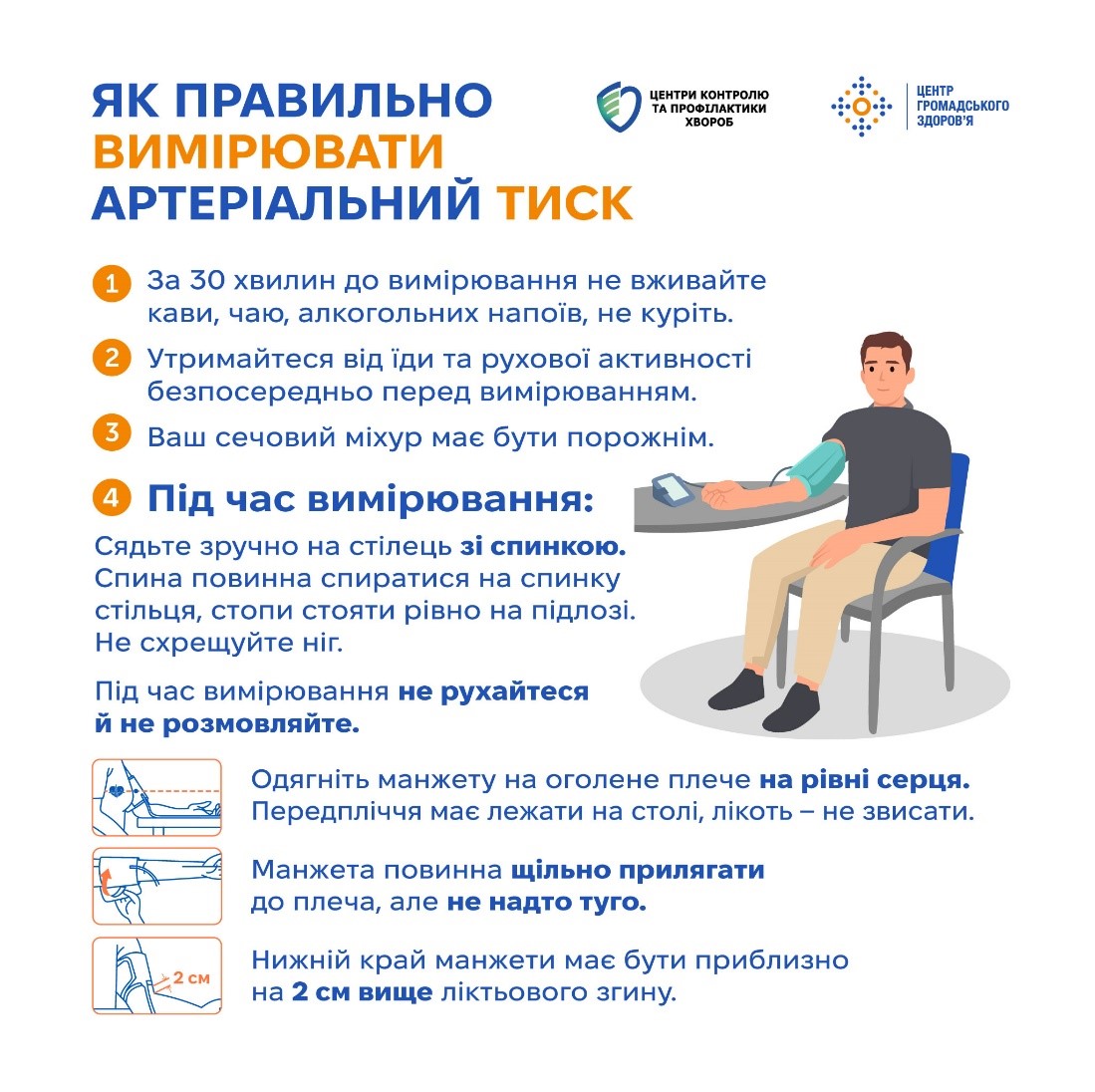 – під час вимірювання сядьте зручно, спиною зіпріться на спинку стільця, стопи поставте на підлогу, не схрещуйте ніг;
