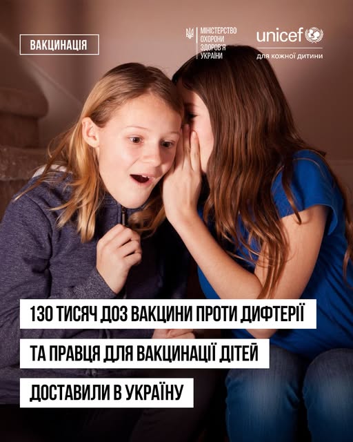 В рамках співпраці з Міністерством охорони здоров’я ЮНІСЕФ закупив та доставив в Україну 130 000 доз вакцини проти дифтерії та правця (АДП). Вакцина призначена для щеплення дітей за Національним календарем щеплень. Вона буде розподілена між областями.